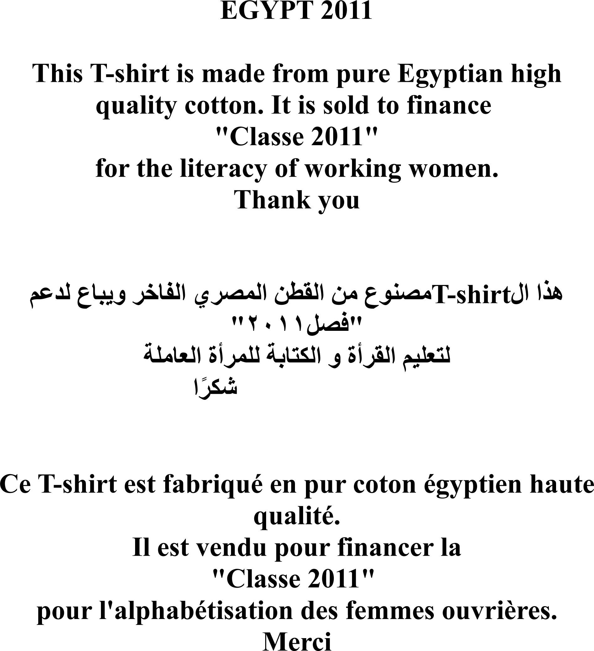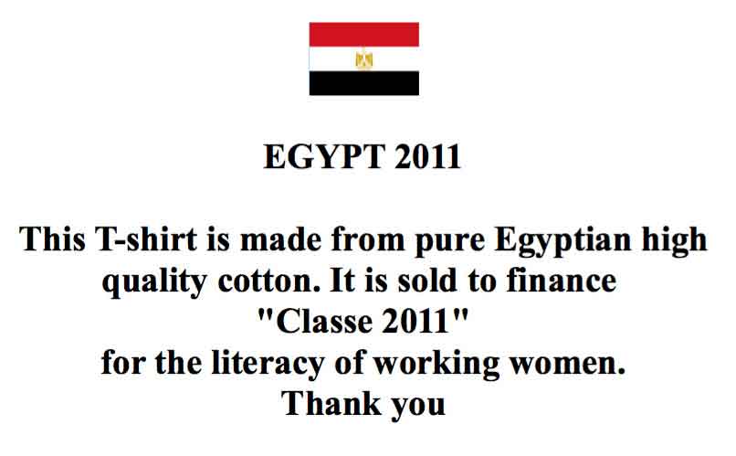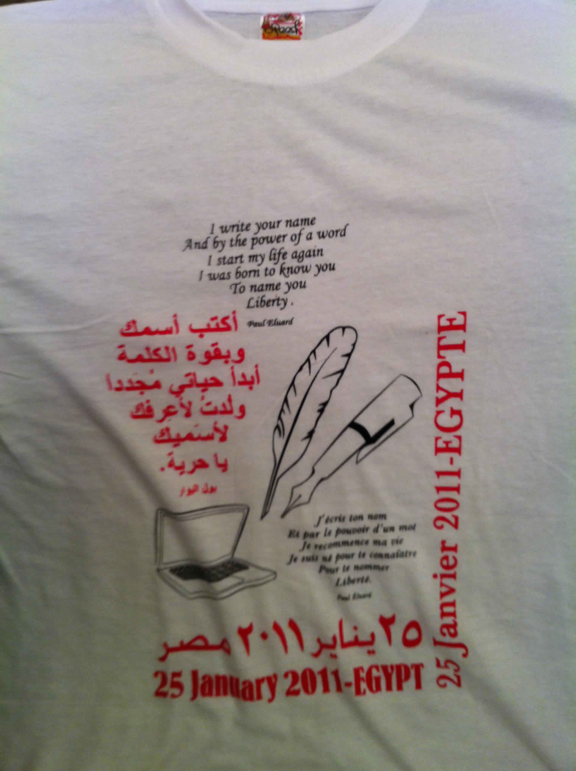 Nous avons conçu un T-shirt poétique en hommage à la Révolution et nous le vendons pour financer le projet. Le financement de ce T-shirt a été assumé par Monsieur Émile Ghattas et le design est signé Sherine Khawam. Il est fait de pur coton égyptien de haute qualité. Plusieurs de nos amis nous ont aidé à le vendre, soit dans leurs boutiques du Caire, soit à travers leurs amis du Caire, de Paris et de Montréal. Nous les remercions infiniment pour leur générosité.