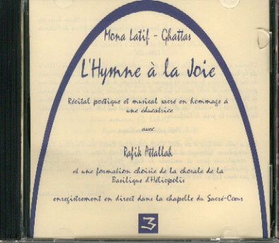 L’HYMNE A LA JOIE, Disque Compact Récital poétique et musical sacré Texte et narration : Mona Latif-Ghattas Chant : Rafik Atallah et une formaion de la chorale de la basilique d’Héliopolis Guitare et flûte : Nader Émile Orgue : Raymond Batroussy |