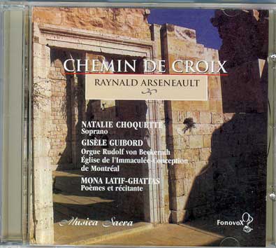 CHEMIN DE CROIX : Disque Compact Oeuvre de Musique contemporraine sacrée pour Orgue, Voix soprano et Récitante Compositeur : Raynald Arsenault Auteur et récitante : Mona Latif-Ghattas Orgue : Gisèle Guibord Voix : Natalie Choquette Producteur : Société Radio Canada 60 minutes |
