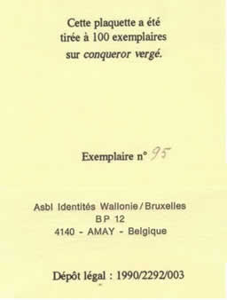 Ma Chambre BelgePoèmes - 11 pagesÉditions L'Arbre à ParolesAmay, Belgique -1990 |